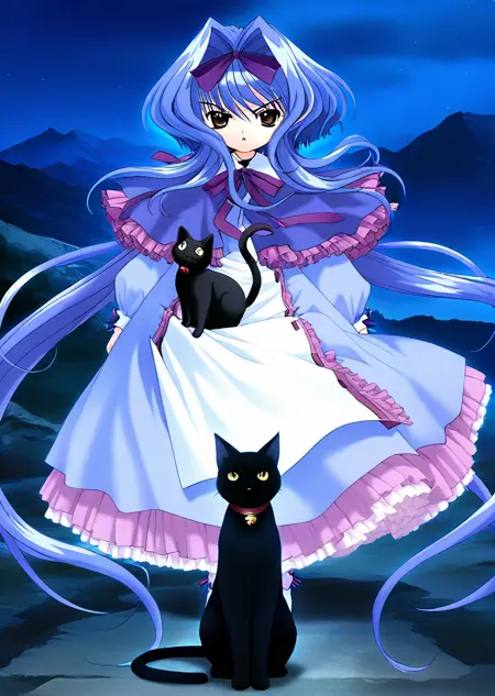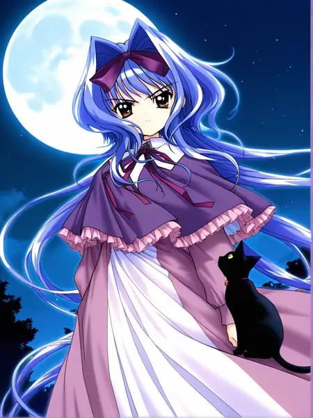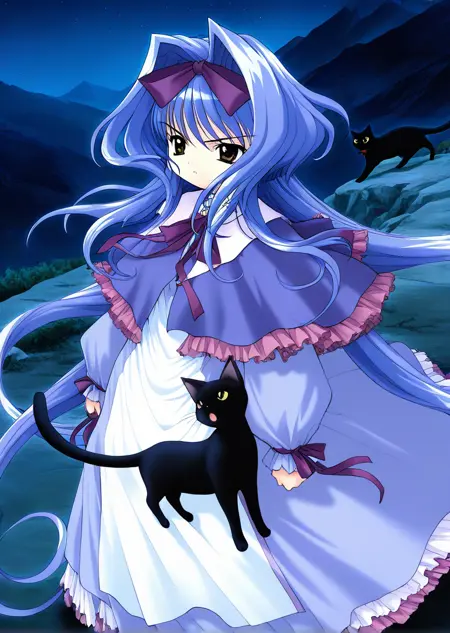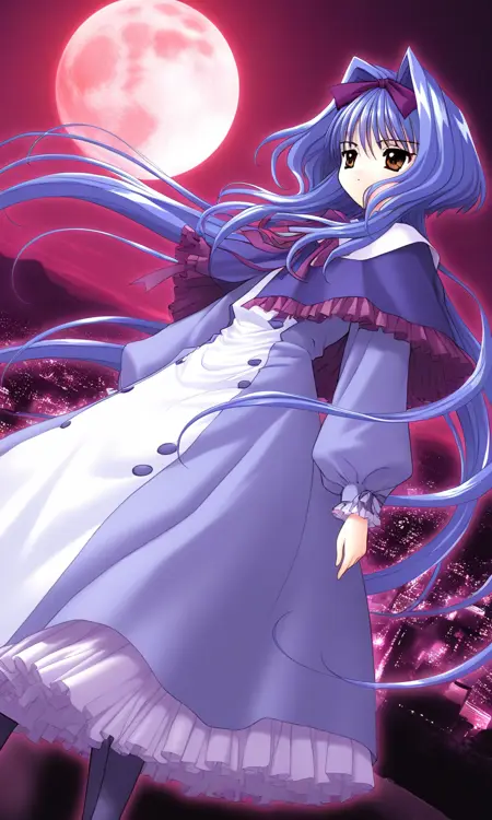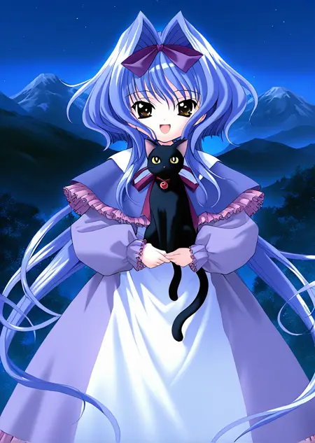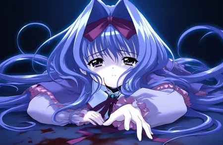 Shion(IES), 1girl, solo, very long hair, blue hair, hair purple ribbon, hair intakes, brown eyes,