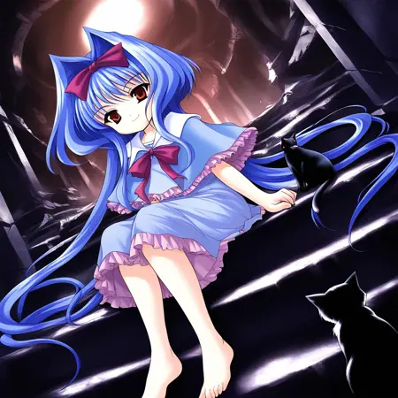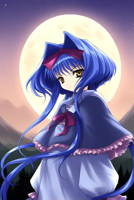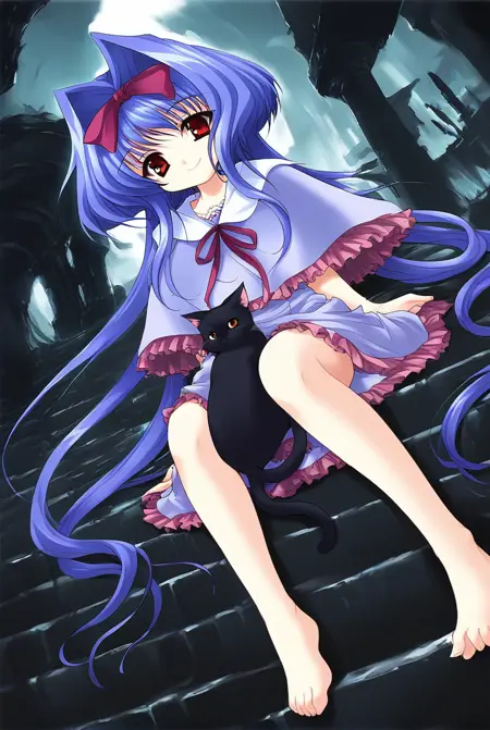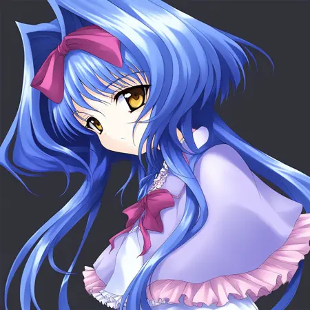 Shion(IES), 1girl, solo, very long hair, blue hair, hair purple ribbon, hair intakes, brown eyes,