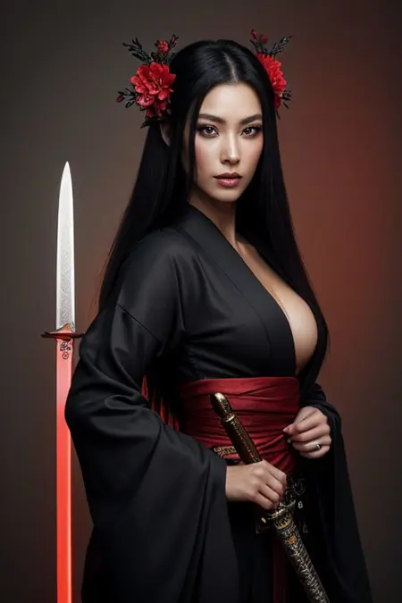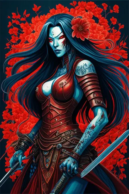 The concept presented revolves around the depiction of "onna-bugeisha," a term referring to women warriors in Japanese history, rendered in the Colorful Japanese Wood Print style