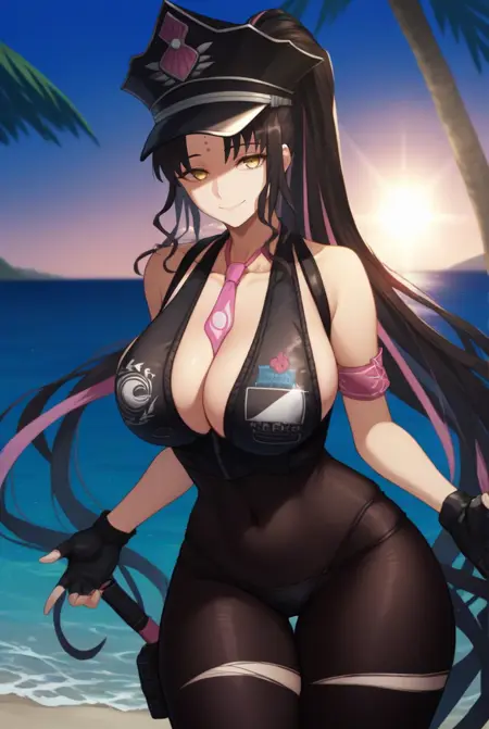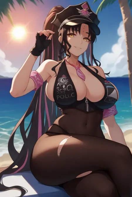 Outfit 3: [Kiara_SwimsuitVtwo, yellow eyes, multicolored hair, streaked hair, long hair, high ponytail, forehead mark, facial mark, swimsuit, black bikini, front zipper swimsuit, black pantyhose, torn pantyhose, halterneck, police hat, armband, pantyhose, covered navel, fingerless gloves, black gloves, pink necktie, bare shoulders, collarbone]