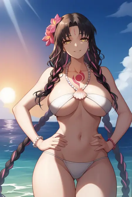 Outfit 2: [Kiara_Swimsuit, yellow eyes, multicolored hair streaked hair, long hair, twin braids, forehead mark, facial mark, hair flower, white bikini, swimsuit, bracelet, shell necklace, seashell, chest tattoo, bare shoulders]