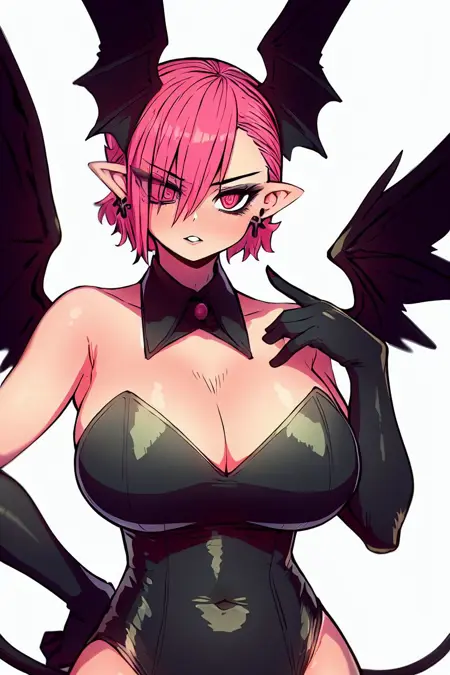 short hair, large breasts, red eyes, gloves,  cleavage, jewelry, tail, pink hair, earrings, wings, pointy ears, pink eyes, leotard,  makeup, detached collar, head wings, demon tail, black leotard, eyeshadow, black wings, black feathers