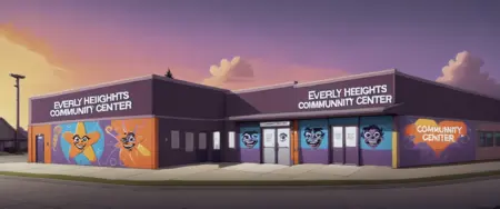 EVERLY HEIGHTS COMMUNITY CENTER —— 生成充满趣味的建筑/房间,装饰有受1990年代尼克儿童频道启发的巨大怪趣面部壁画。