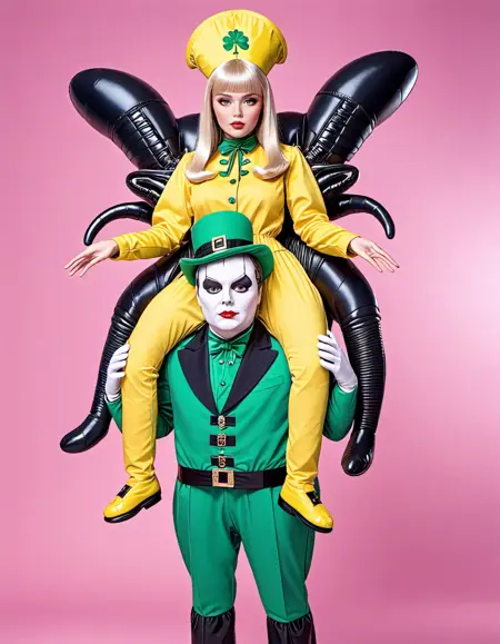 该LoRA可以重现“骑着圣帕特里克节小精灵服装”的场景。用它生成优质图像有点困难,因为该LoRA容易产生三个头、过多的腿和手臂。然而,要生成两个人相互互动的图像也一直很困难。