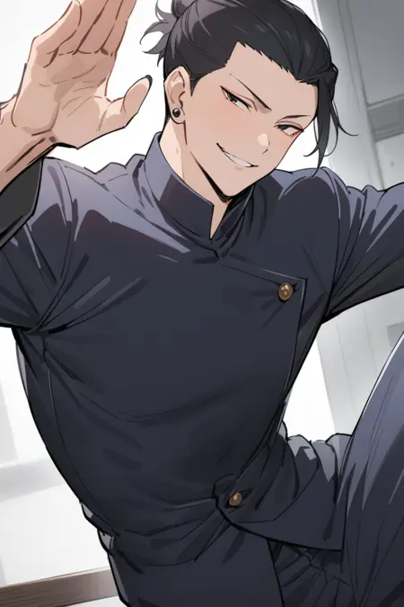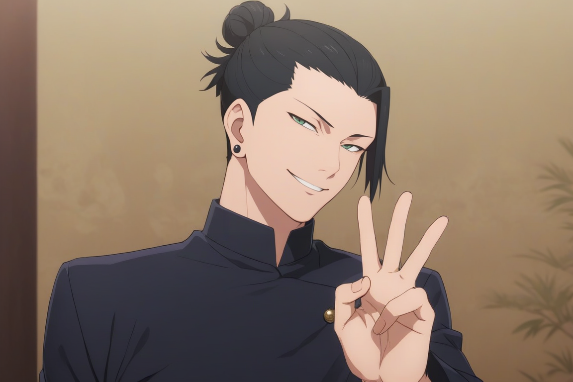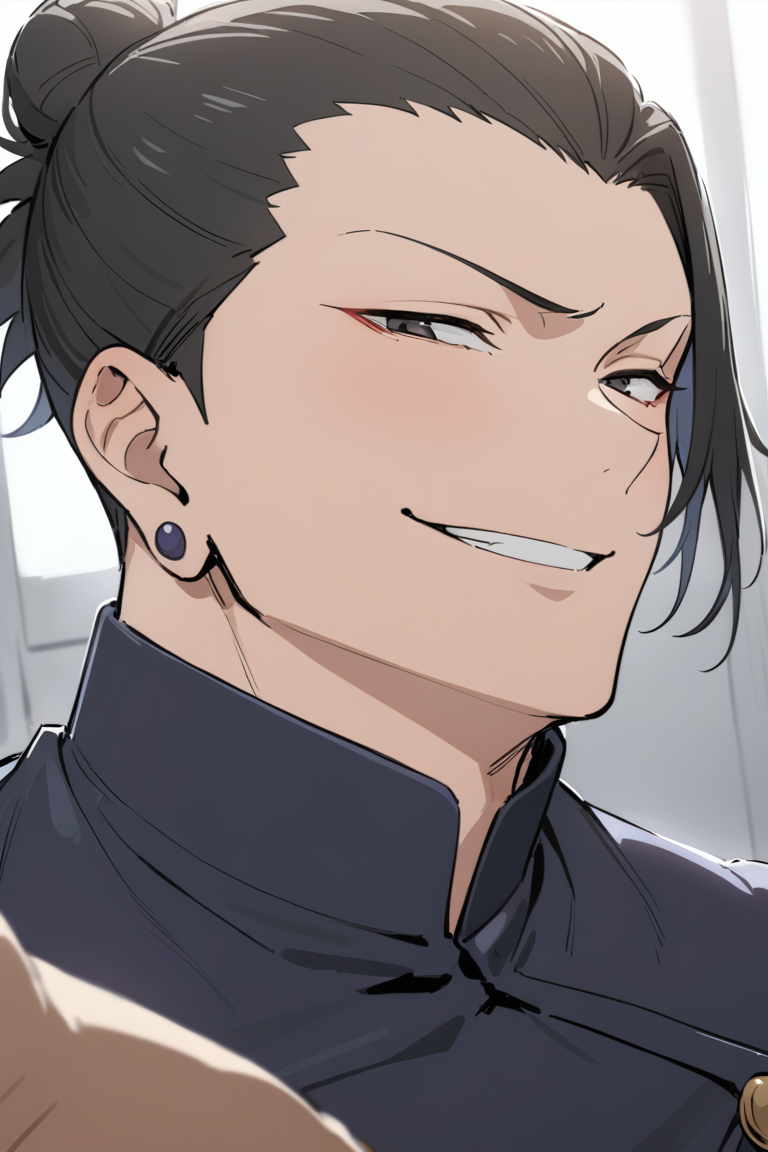 Trigger words-1boy,getou suguru,black_hair,black_eyes,gakuran/kimono,ear_piercing,single hair bun/long hair(for untied hair)