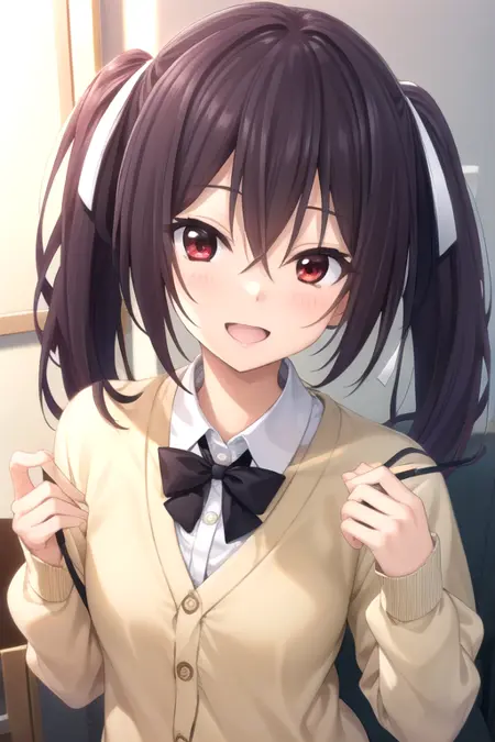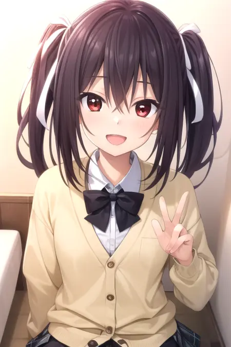 black bow,cardigan sweater,beige sweater,collared shirt,white shirt,long sleeves,small breasts,plaid skirt,pleated skirt,black socks,loafers