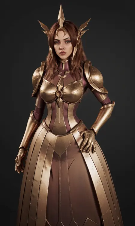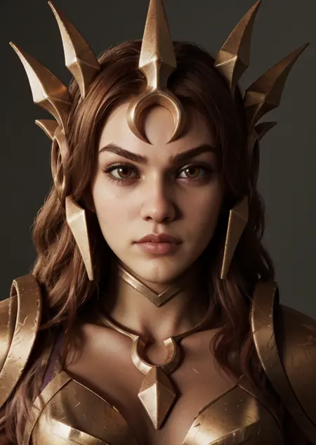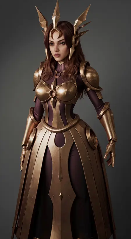 - 1girl, leonalol, 棕色波浪发,头饰皇冠,((official leona_(league_of_legends))), ((金色装甲紫色长裙)),