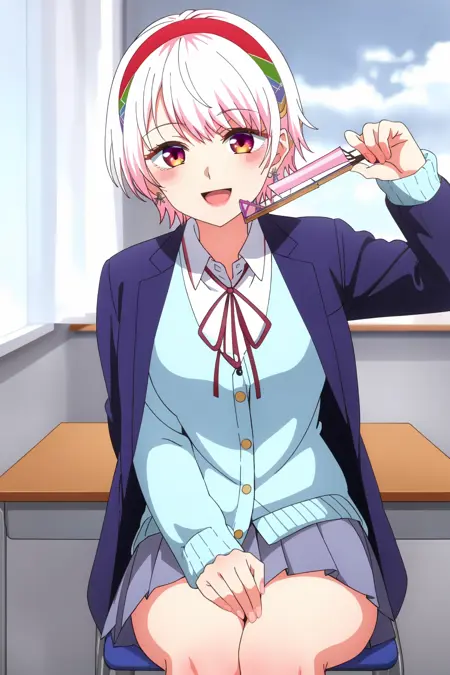 skirt, school uniform, jacket on shoulders, earrings, jewelry, red hairband, long sleeves, blue jacket, white shirt, neck ribbon, blazer, collared shirt, headband, sleeves past wrists