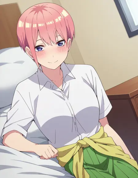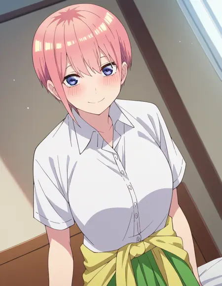 ichika nakano, short hair, bangs, blue eyes, hair between eyes, pink hair,