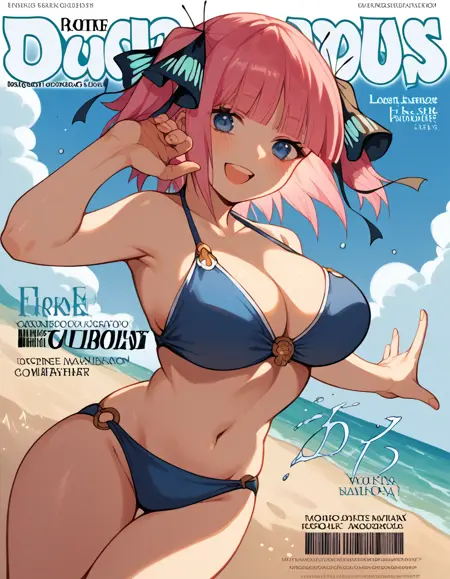 nino nakano, short hair, bangs, blue eyes, hair ornament, hair ribbon, pink hair, blunt bangs, two side up, butterfly hair ornament,