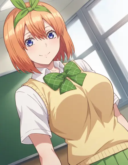 yotsuba nakano, bangs, short hair, blue eyes, hair between eyes, hair ribbon, hairband, orange hair, green ribbon, smile, grin, mature female,