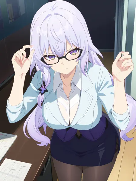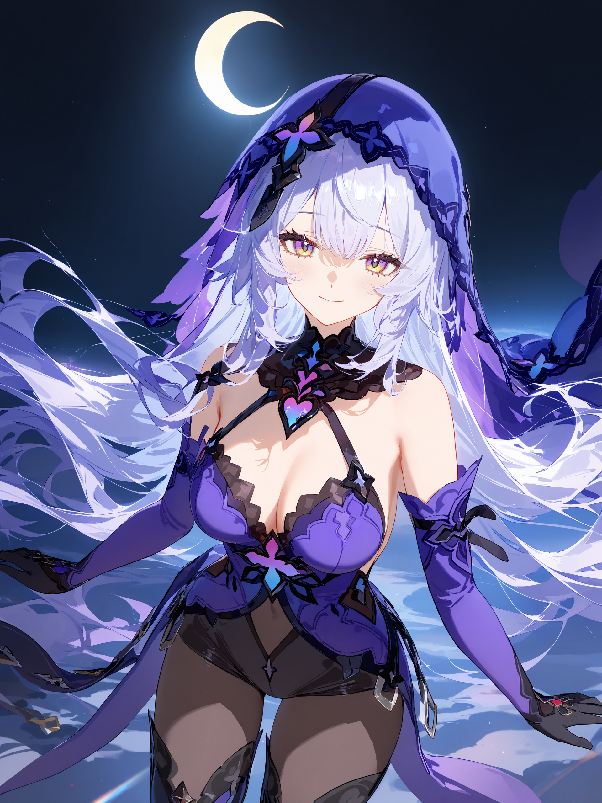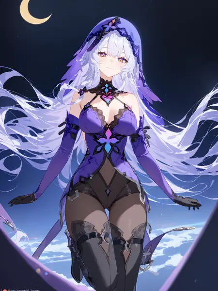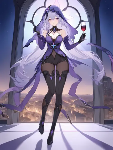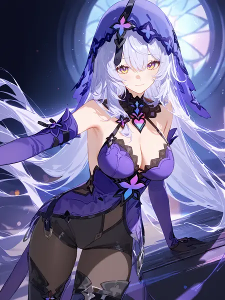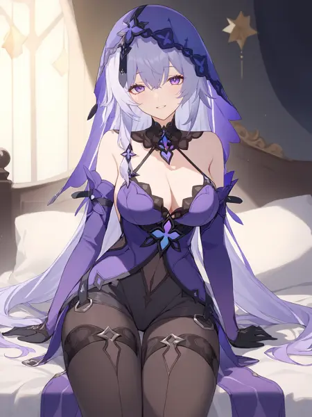 Additional prompts for default costume: black gloves, veil, thigh boots, detached sleeves, purple halter dress, (pantyhose), short shorts, detached collar