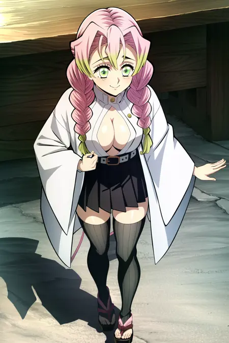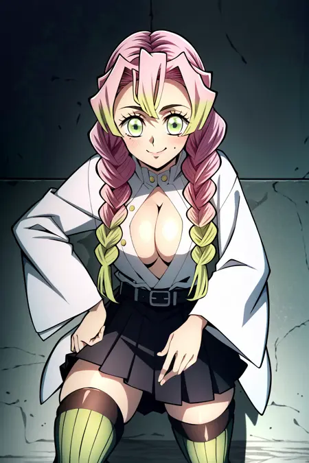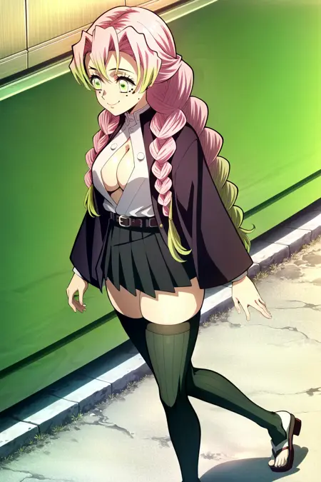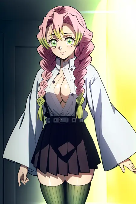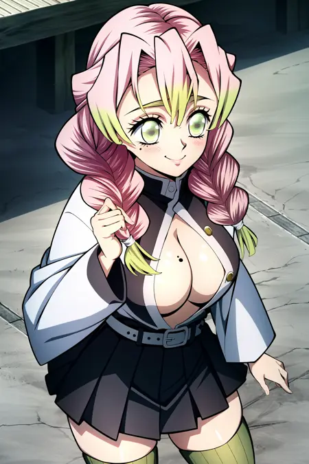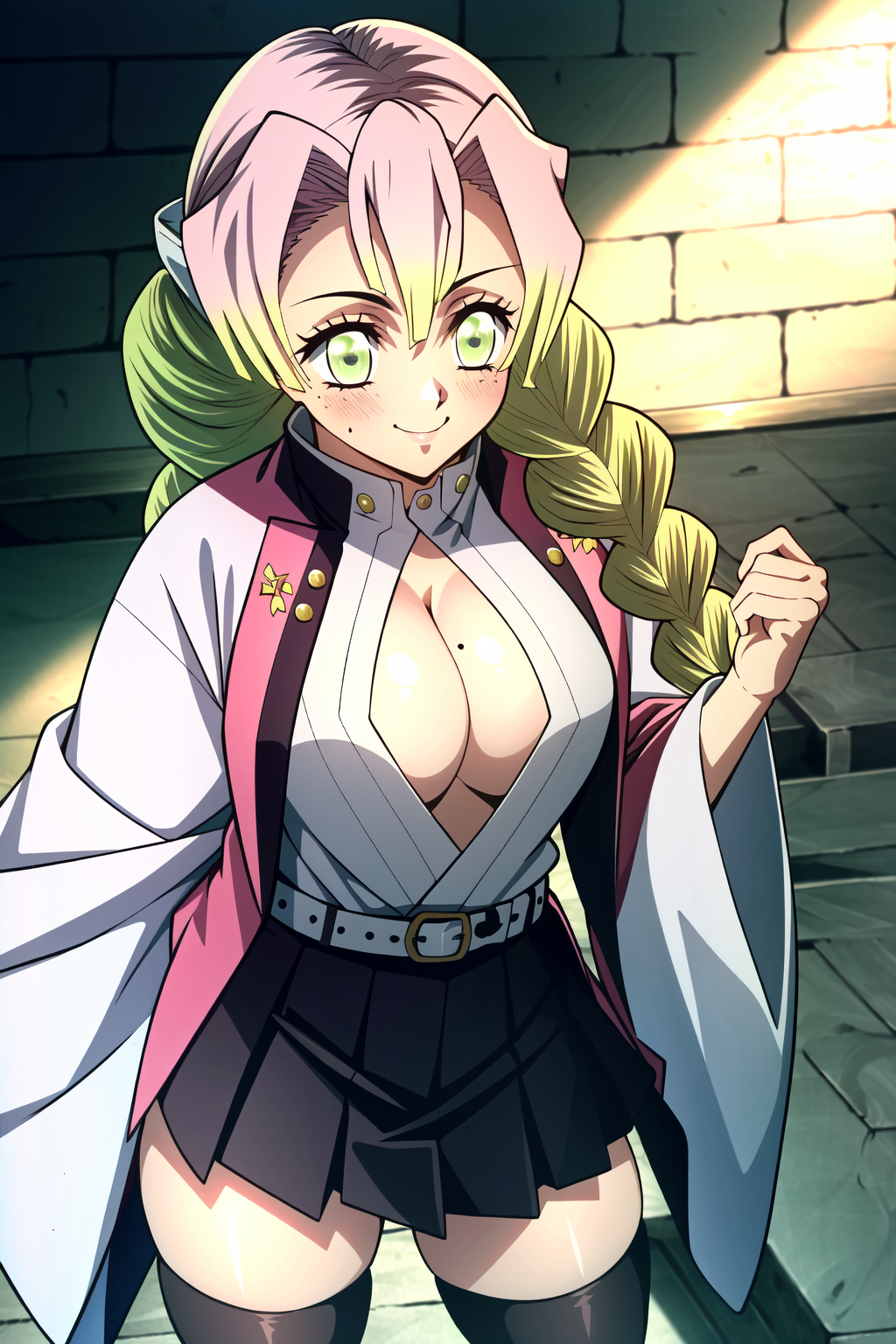 Mitsuri Kanroji, 1girl, kanroji mitsuri, demon slayer uniform, mole under eye, solo, mole, breasts, skirt, thighhighs, multicolored hair, green eyes, green thighhighs, green hair, long hair, pink hair, cleavage, smile, braid, japanese clothes, black skirt, belt, haori, pleated skirt, zettai ryouiki, gradient hair, miniskirt, partially unbuttoned, long sleeves, large breasts, closed mouth, two-tone hair, open clothes, ribbed legwear