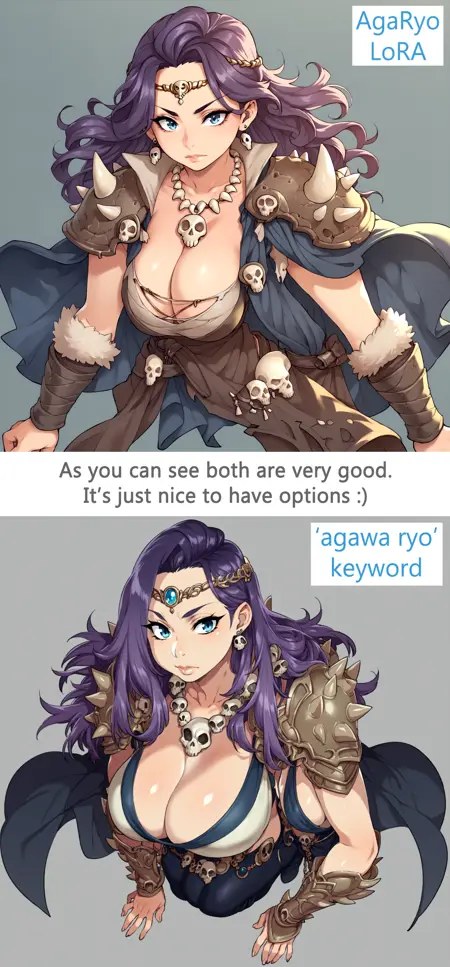 이 LORA와 함께 "agawa ryo" 키워드를 사용하지 마세요. 이는 Pony 모델의 트리거이며, 서명 워터마크가 생성될 확률을 크게 높입니다.