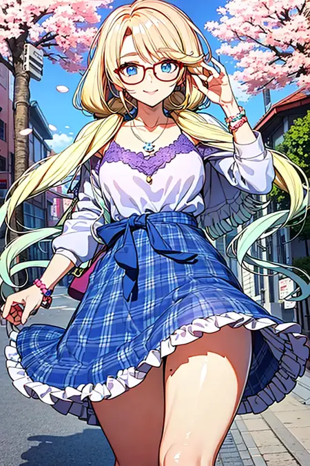 (plaid dress:1.2), frills, bracelet, capelet, collarbone, pendant, purple waistband, scrunchie, necklace, jewelry,
