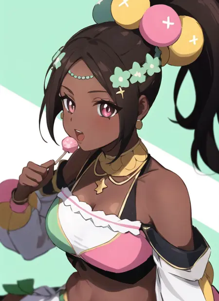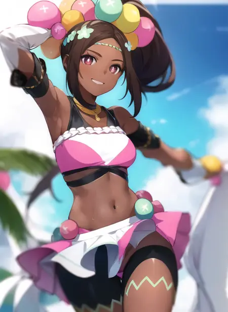 1girl, bike shorts, multicolored white pink crop top, navel, multicolored frilled_skirt, dark-skinned_female, jewelry, long_hair, ponytail, hair ornament flower hairband, multicolored beads bubbles, brown_eyes, symbol-shaped pupils star \(symbol\), (red_eyes:0.66), black_eyes ; lora:timerra-v3-10:0.75