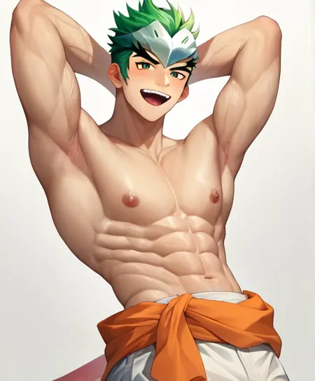 Mauga: muscular [48], beard [48], multicolored hair [48], black hair [48], mauga [48], dark skin [45], tattoo [45], 1boy [44], solo [43], smile [42], chest tattoo [41], large pectorals [37], headband [37], mechanical parts [29], looking at viewer [28], nipples [26], jewelry [23], grin [21]