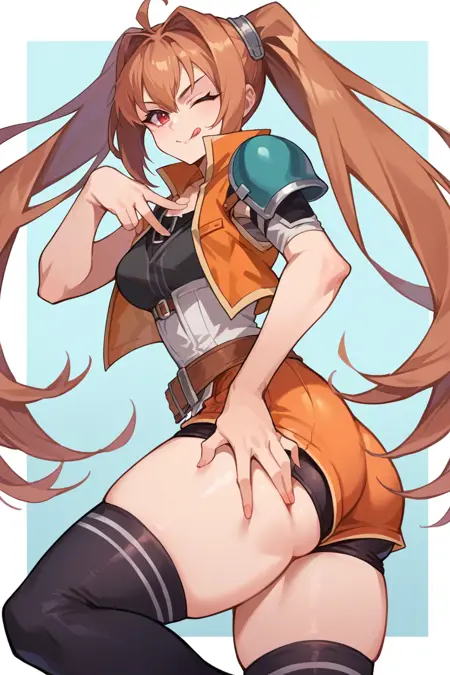 Add "senEstelle, twintails, single shoulder pad, choker, orange jacket, black shirt, miniskirt, green belt, black gloves, spandex shorts, black thighhighs" for her Sen IV look.