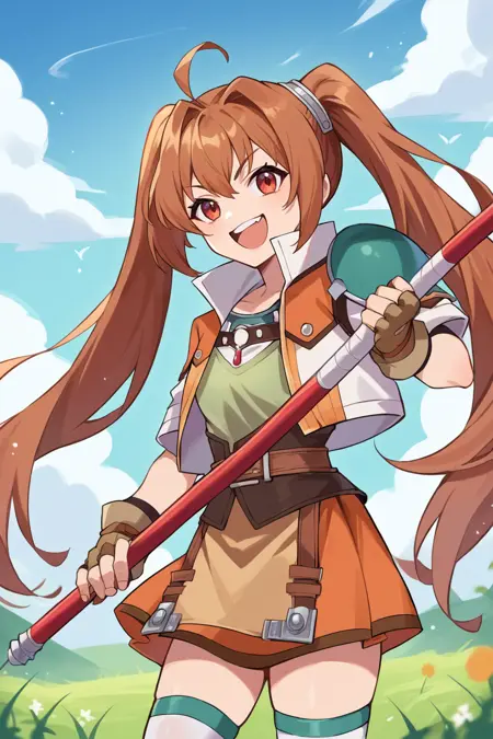 • 添加 "scEstelle, 双马尾, 短款夹克, 橙白夹克, 绿色肩甲, 卡其色衬衫, 橙色裙子, 腰带, 白色过膝袜, 棕色手套, 橙色靴子" 以获取她的 SC 造型。
