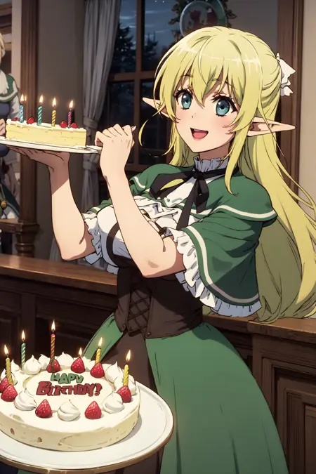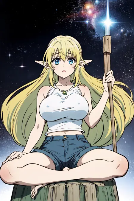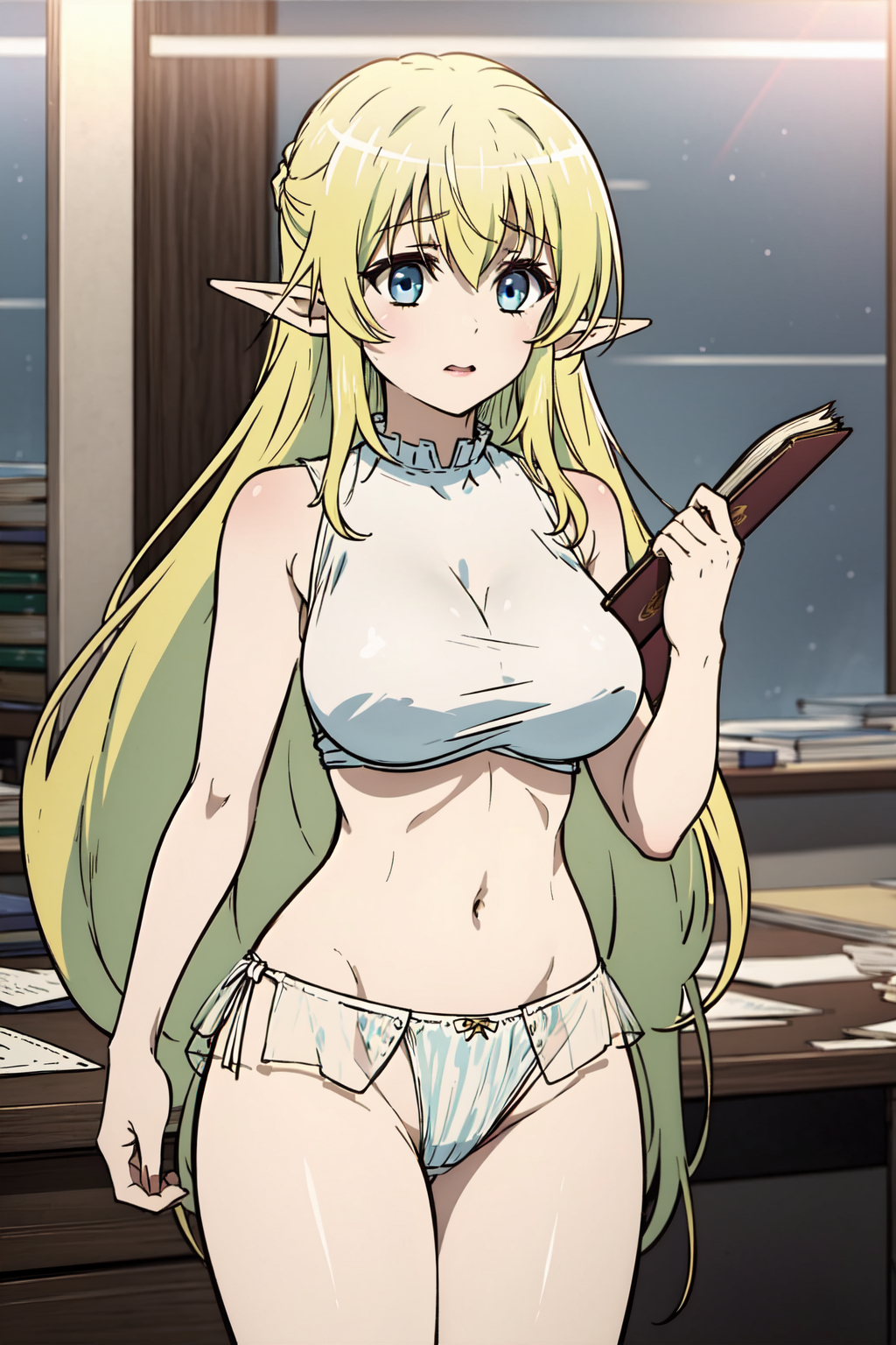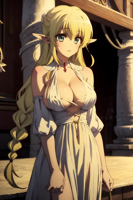 Appearance: 1girl, solo, long hair, braid, blue eyes, blonde hair, large breasts, pointy ears, elf, bangs
