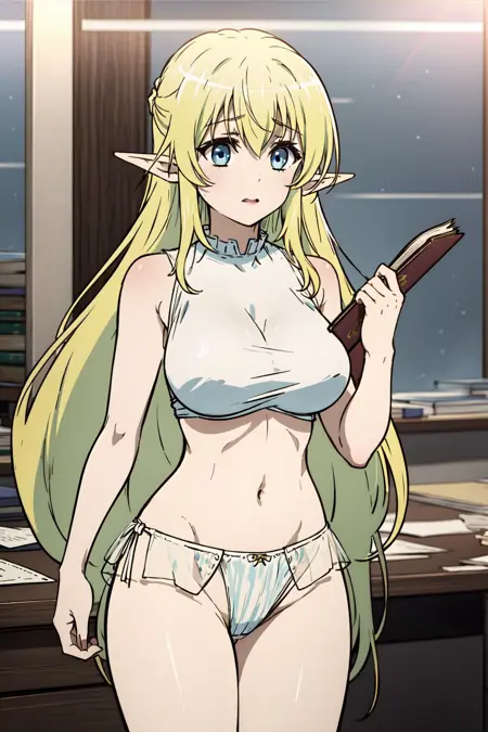 外观:1个女孩,单独,长发,辫子,蓝眼睛,金发,大乳房,尖耳朵,精灵,刘海