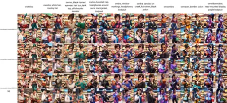 ほとんどのキャラクターの衣装は一貫しておらず、3D スタイルの強さはプロンプトによって異なります。重みと 3d タグが生成に与える影響を確認するには、x/y プロットのサンプルを参照してください。低い重みでキャラクターの外見が失われた場合は、キャラクターの髪の色をタグで指定してください。