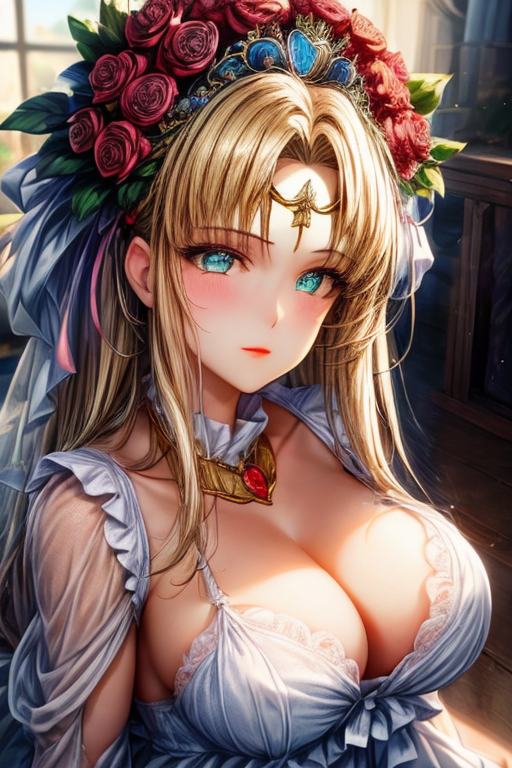 Trigger word: aphrodite_a, blonde hair, yellow eyes, rose tiara, circlet, hair flower, white Aphrodite dress,