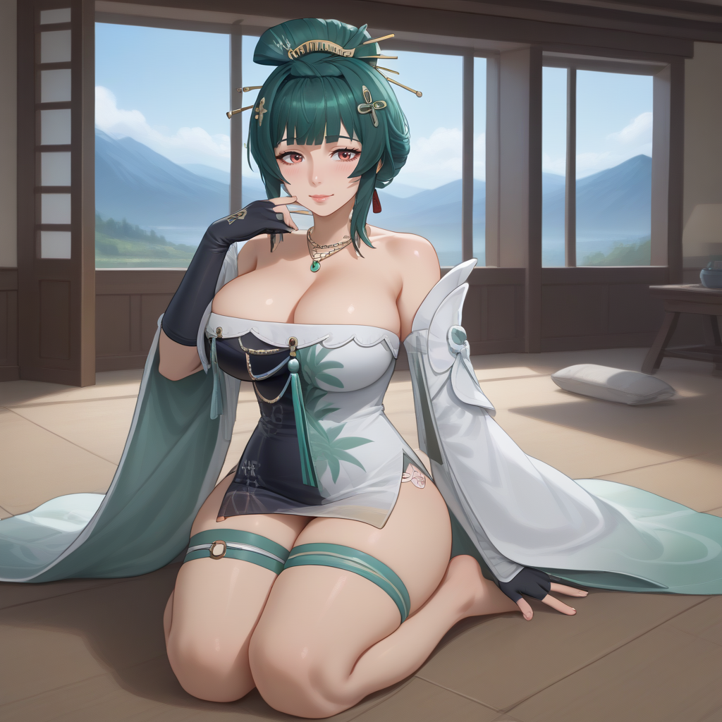 I didn't want the word "sitting" to interfere with any of the other poses by becoming a trigger word, so instead I used the word "seated". If it was trained correctly, it shall have your character sitting on a chair or something.