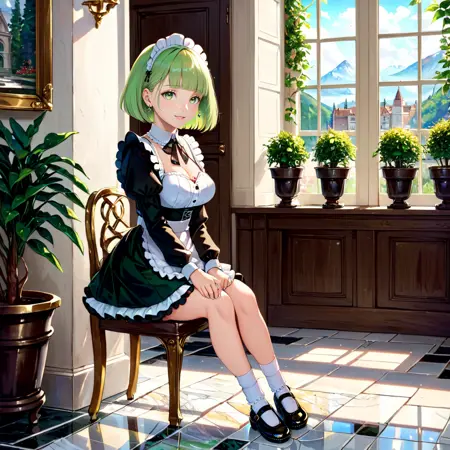 I didn't want the word "sitting" to interfere with any of the other poses by becoming a trigger word, so instead I used the word "seated". If it was trained correctly, it shall have your character sitting on a chair or something.