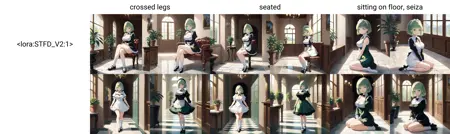 The dataset for this LoRA initially had 1474 images of various poses but I had to reduce it to 1000 for Civitai. As a result, some poses aren't quite as good as I'd like, so a different approach will be warranted later down the line. For now, this model seems to excel at sitting in chairs with/without legs crossed.