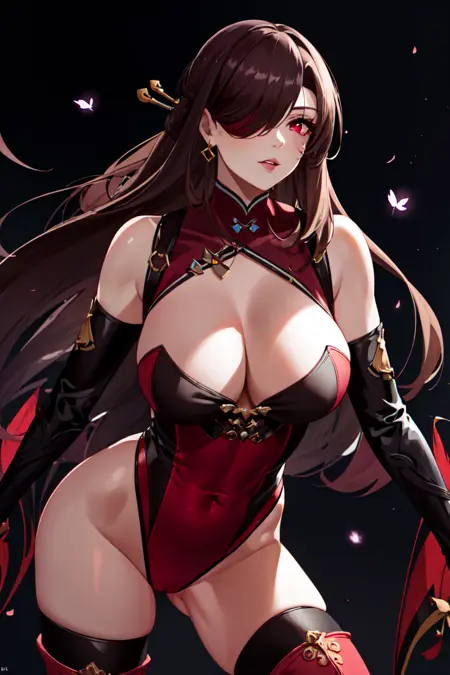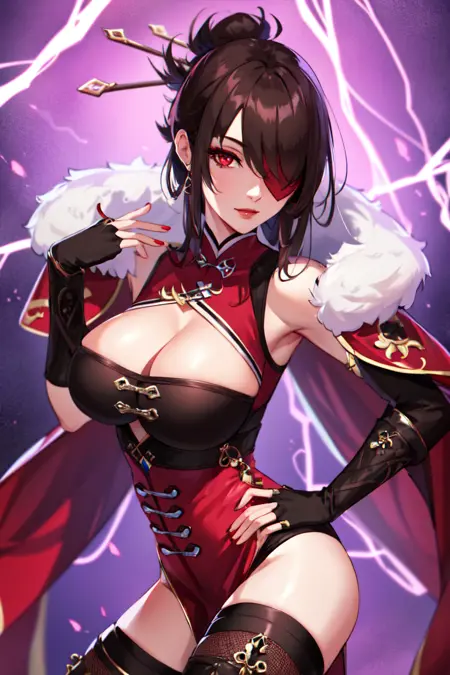is beidouep. To recreate Beidou's original outfit you will need some extra triggers such as: start with ogoutfit that's was my main idea how to separate generations for variety; hair stick — her unique hairpin, i don't recommend using any other words to describe it; fingerless gloves, fur trim, thigh boots, pelvic curtain. Those are main components of her original outfit and you can use them in negative prompt as well. You can also try adding cleavage cutout if it's not showing up or you can add that to negative prompt if you don't want it.