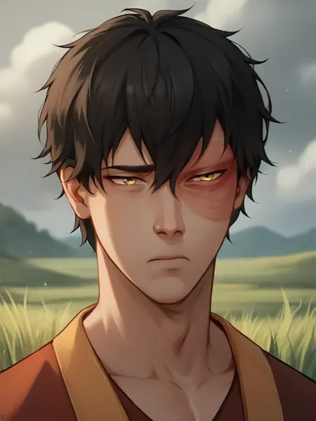 Prompts: zuko, black hair, scar across eye, yellow eyes