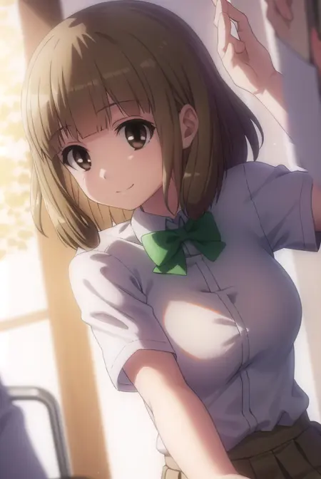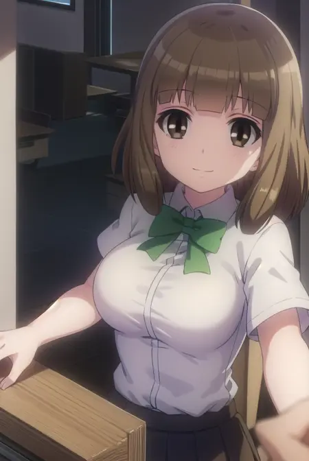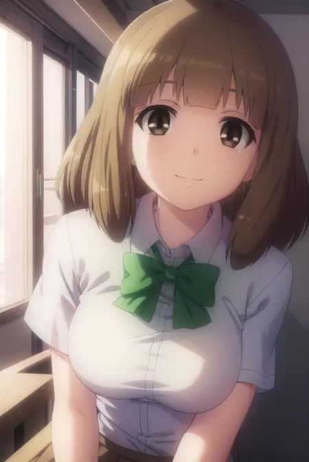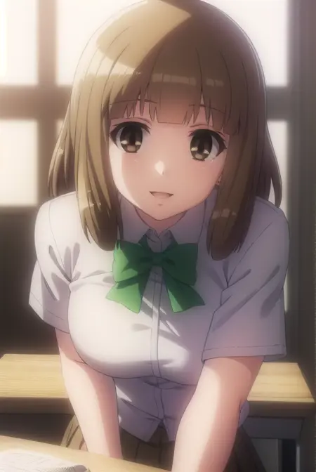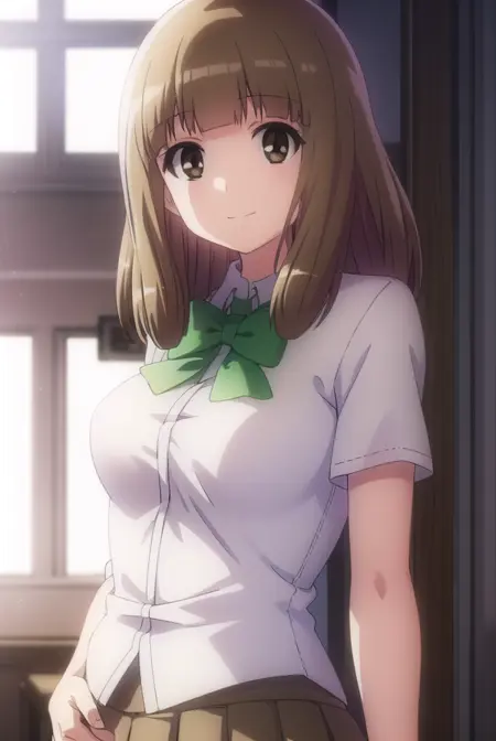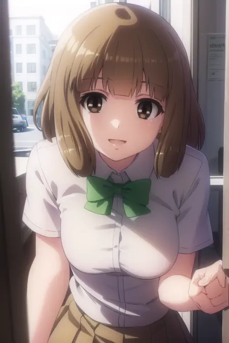 yuu naruse, brown hair, (brown eyes:1.5), bangs, blunt bangs, medium hair,