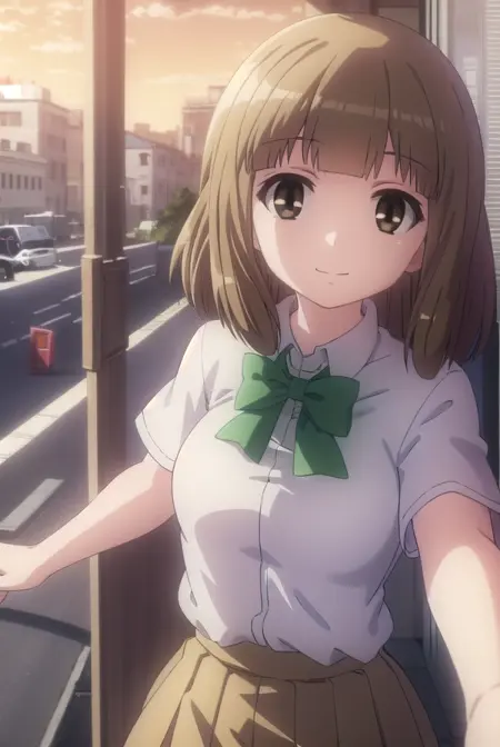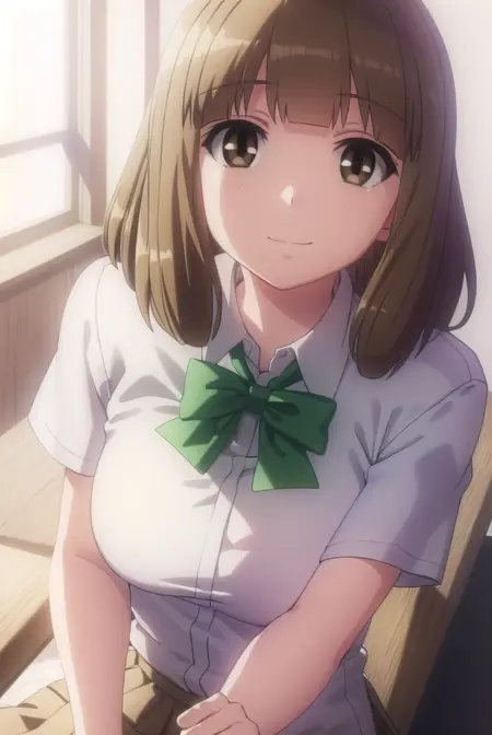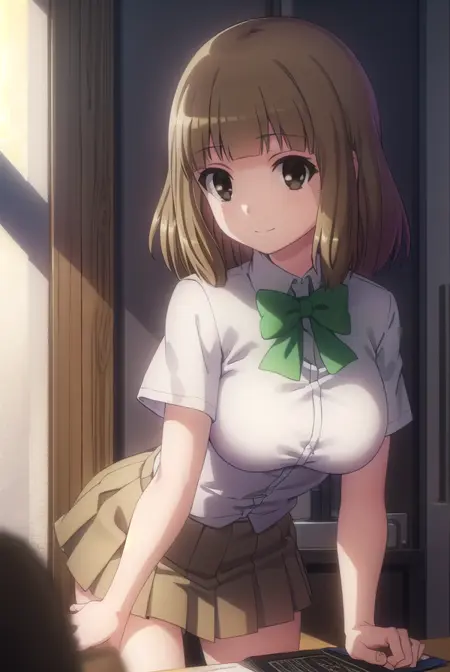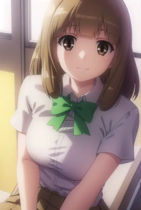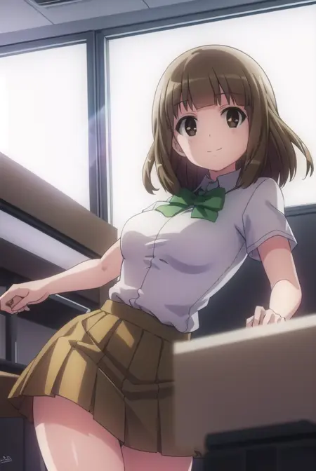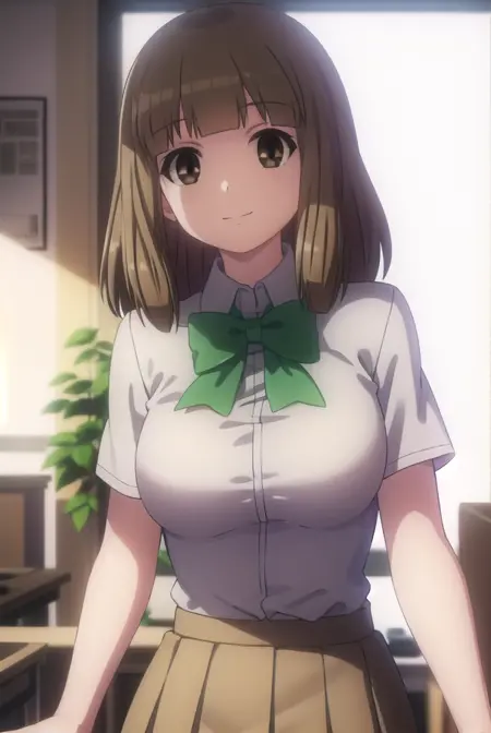 skirt, school uniform, bow, bowtie, green bowtie, shirt, white shirt, collared shirt, short sleeves, pleated skirt, brown skirt,