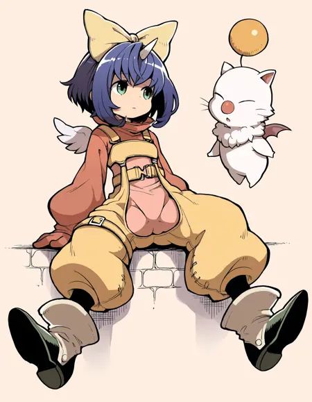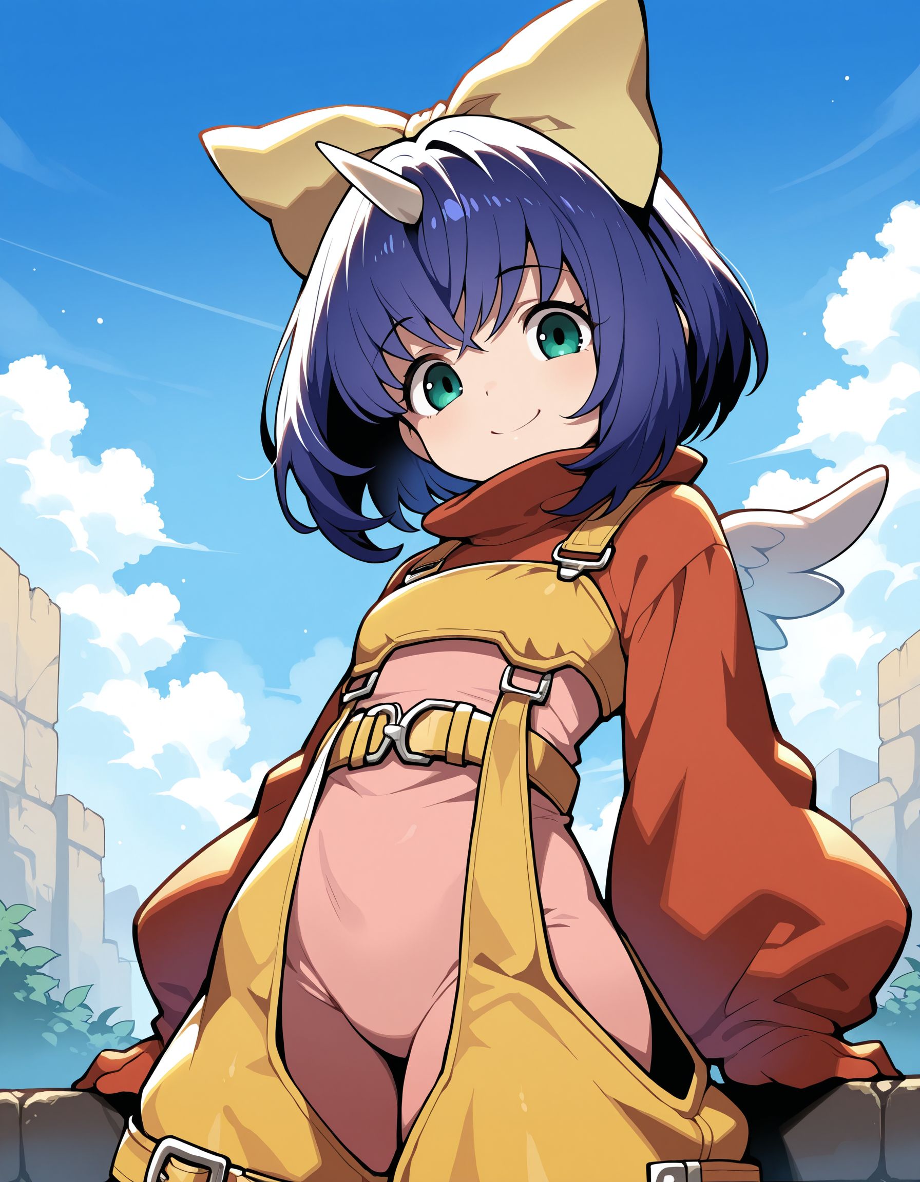 Add "hair bow,sweater,overalls,yellow belt,bodysuit,socks,boots,wings" for her typical look.