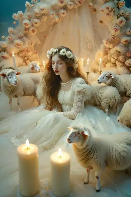 推奨プロンプト: dress,candle, sheep, white dress, depth of field, lips, long sleeves, indoors, lace, blunt bangs, lace trim, lace-trimmed sleeves, candlestand,window, day,