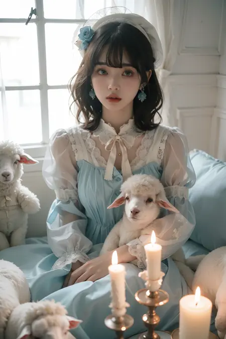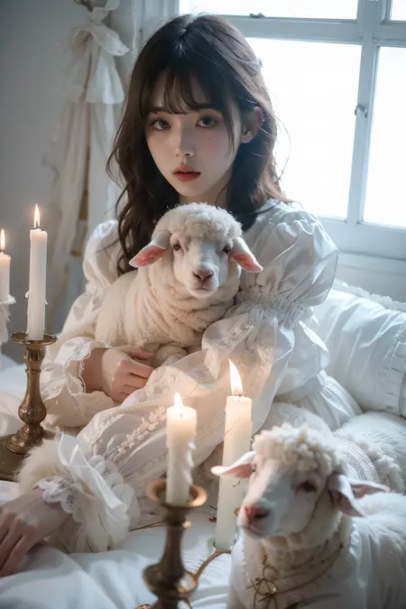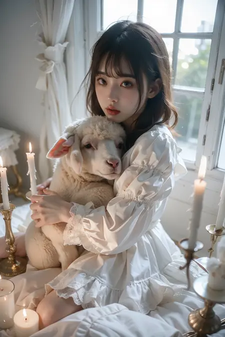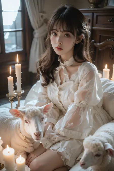 推荐提示词:dress,candle, sheep, white dress, depth of field, lips, long sleeves, indoors, lace, blunt bangs, lace trim, lace-trimmed sleeves, candlestand,window, day,