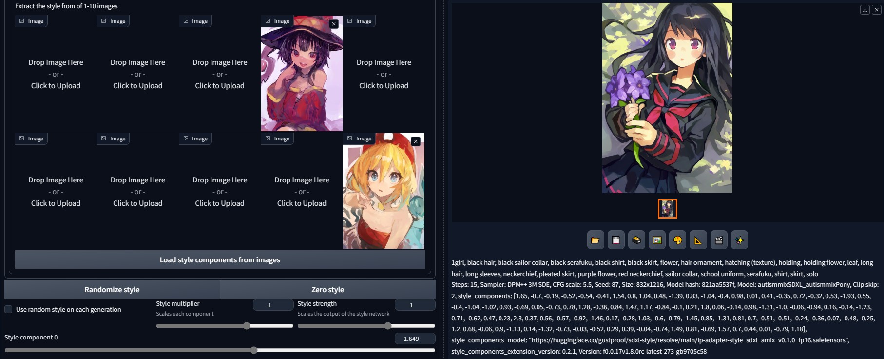 In v0.2.0, an additional Forge extension supporting exclusively SDXL (AutismmixPony) is added. Note that now the style components have different meanings from v0.1 (SD1).