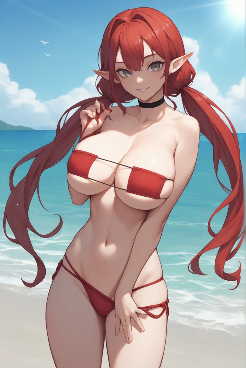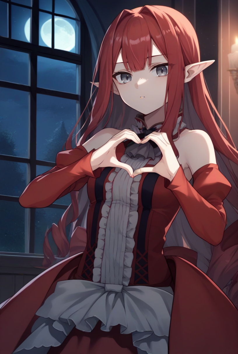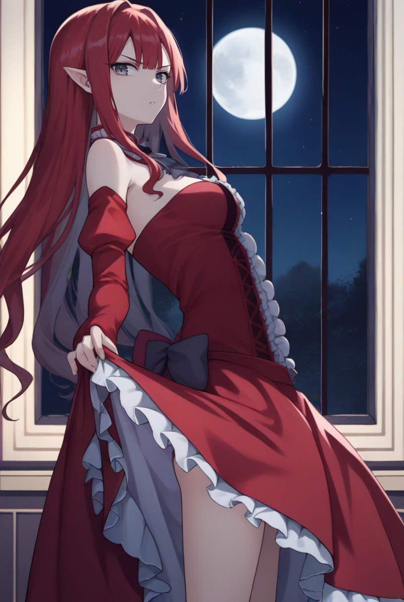 Outfit 1: ["baobhandefault, grey eyes, red hair, long hair, sidelocks, pointy ears, headpiece, red dress, detached sleeves, detached collar, center frills, frills, bare shoulders, ribbon"]