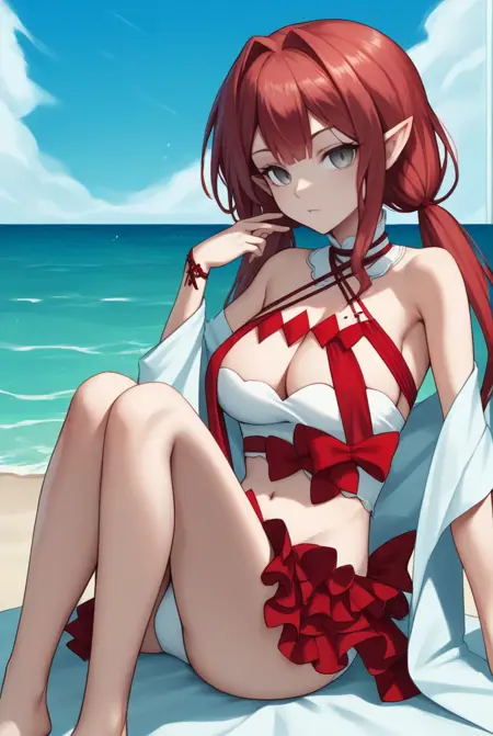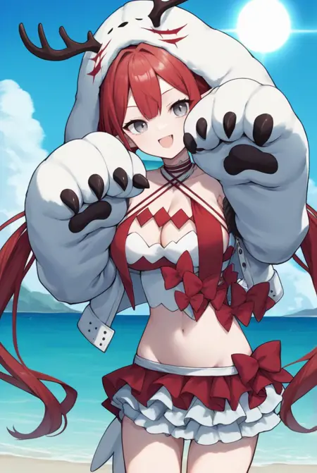 Outfit 4: ["BaobhanSwimsuit, grey eyes, red hair, long hair, sidelocks, twintails, low twintails, pointy ears, white crop top, red dress, criss-cross halter, swimsuit, bikini, fur trim, off shoulder, open jacket, animal hood, hood up, antlers, animal hands, frilled skirt, detached collar, bare shoulders"]