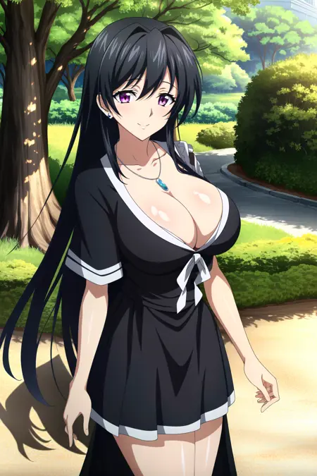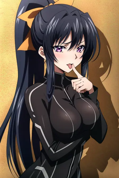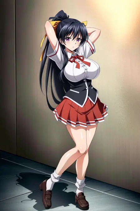 Akeno Himejima, 1girl, himejima akeno, solo, long hair, school uniform, very long hair, black hair, purple eyes, ponytail, ribbon, red skirt, hair ribbon, large breasts, socks, breasts, arms behind head