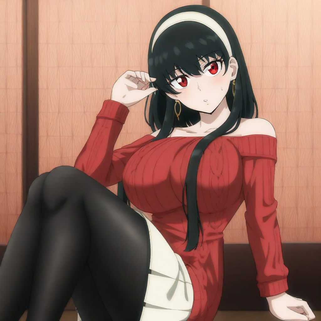 red sweater, long sleeves, short hair with long locks, gold earrings, white hairband, sweater dress, red eyes, large breasts, jewelry, black pantyhose, off shoulder