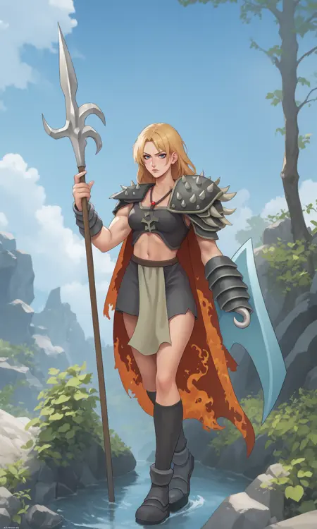 1girl, blonde hair, armor , weapon , blue eyes , solo, polearm, ((shield)), hook hand , holding, boots, long hair, pauldrons, shoulder armor, holding weapon, holding polearm, holding shield, cape