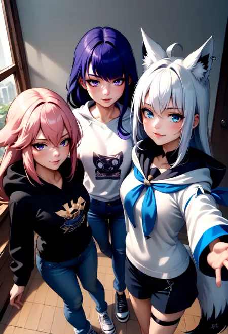 So, what changed? First of all, I tweaked the prompt slightly. I changed "2girls" to "3girls", swapped the positions of hoodie, jeans in the prompt, and added another BREAK to introduce another character. In the Regional Prompt Settings, I simply added another Divide Ratio; in this case, it's 1,1,1.