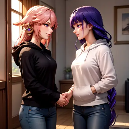 score_9, score_8_up,score_7_up, source_anime, indoors, standing, cowboy shot, 2girls, seductive smile, looking at another, hoodie, jeans, handshake, <lora:concept_handshake_ponyXL:0.5>,