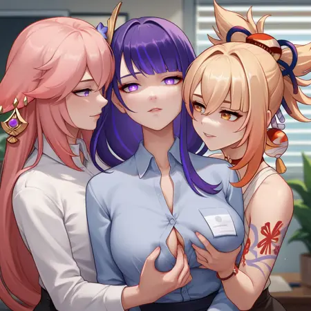 masterpiece, best quality, newest, absurdres, highres, color wheel challenge, multiple girls, raiden shogun, close-up,