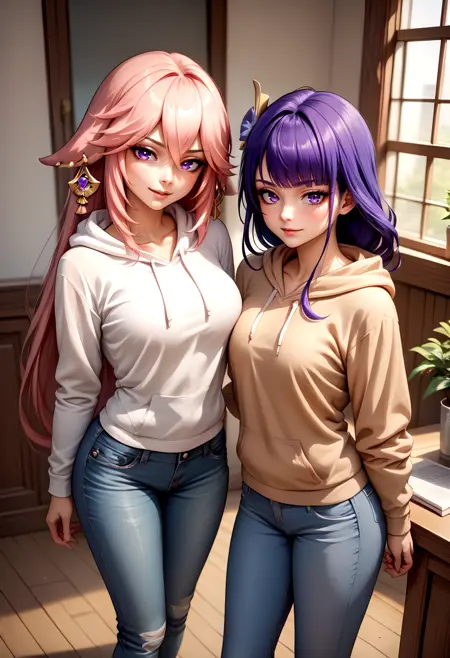 score_9, score_8_up,score_7_up, source_anime, indoors, standing, cowboy shot, 2girls, seductive smile, looking at viewer, hoodie, jeans, hug,