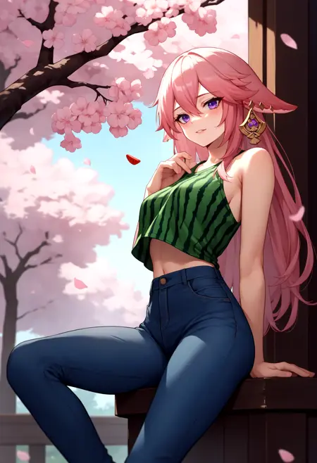score_9, score_8_up, score_7_up, source_anime, 1girl, cherry blossoms, shirt, watermelon, watermelon print, jeans, yae miko,