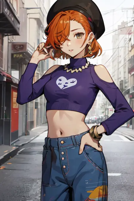| トレーニングワード | KanonTachibana, 1girl, solo, short hair, purple shirt, print shirt, crop top, long sleeves, brown eyes, jewelry, earrings, midriff, navel, pants, necklace, orange hair, hair over one eye, bracelet, clothing cutout, black headwear, beret, shoulder cutout, コピーしました! |