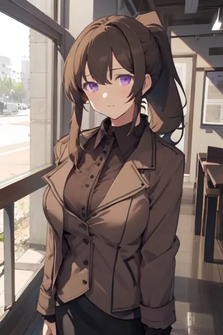 TioEvenicle, 1girl, solo, long hair, skirt, large breasts, brown hair, shirt, purple eyes, brown jacket, ponytail, black pantyhose, pencil skirt,